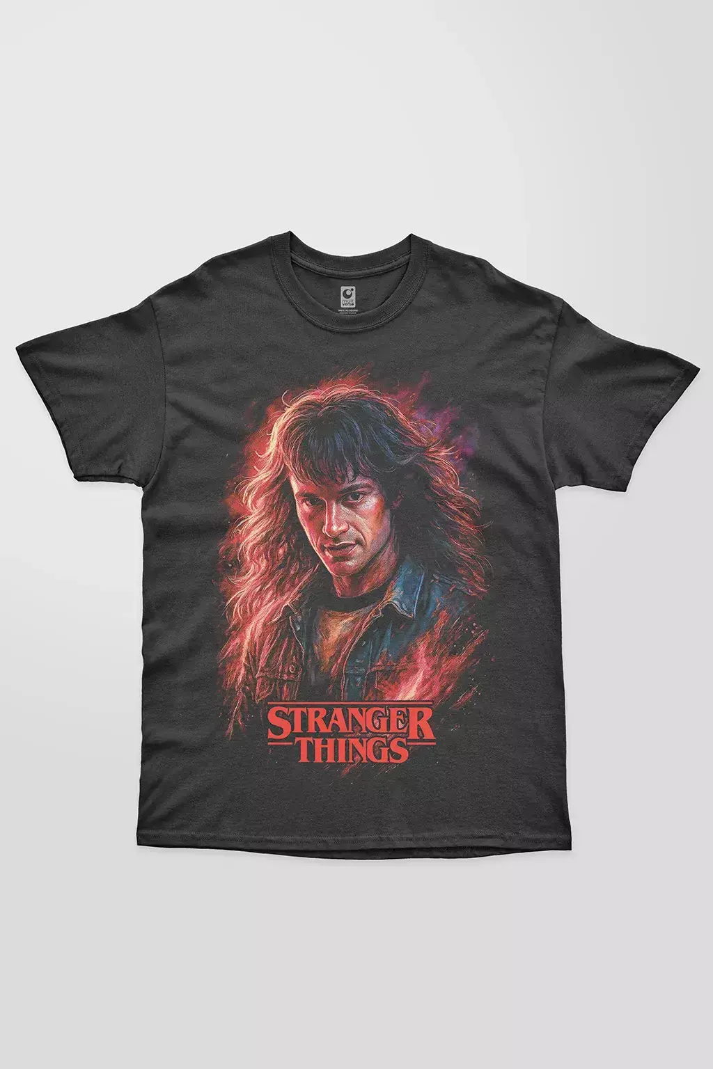 Produção nacional com malha 100% algodão penteado fio 30.1 de alta qualidade, reforço ombro a ombro e tecido anti-pilling para evitar bolinhas. A estampa DTF captura a essência rockstar de Eddie Munson com alta definição e resistência ao uso, ideal para streetwear geek com vibe Hellfire Club.