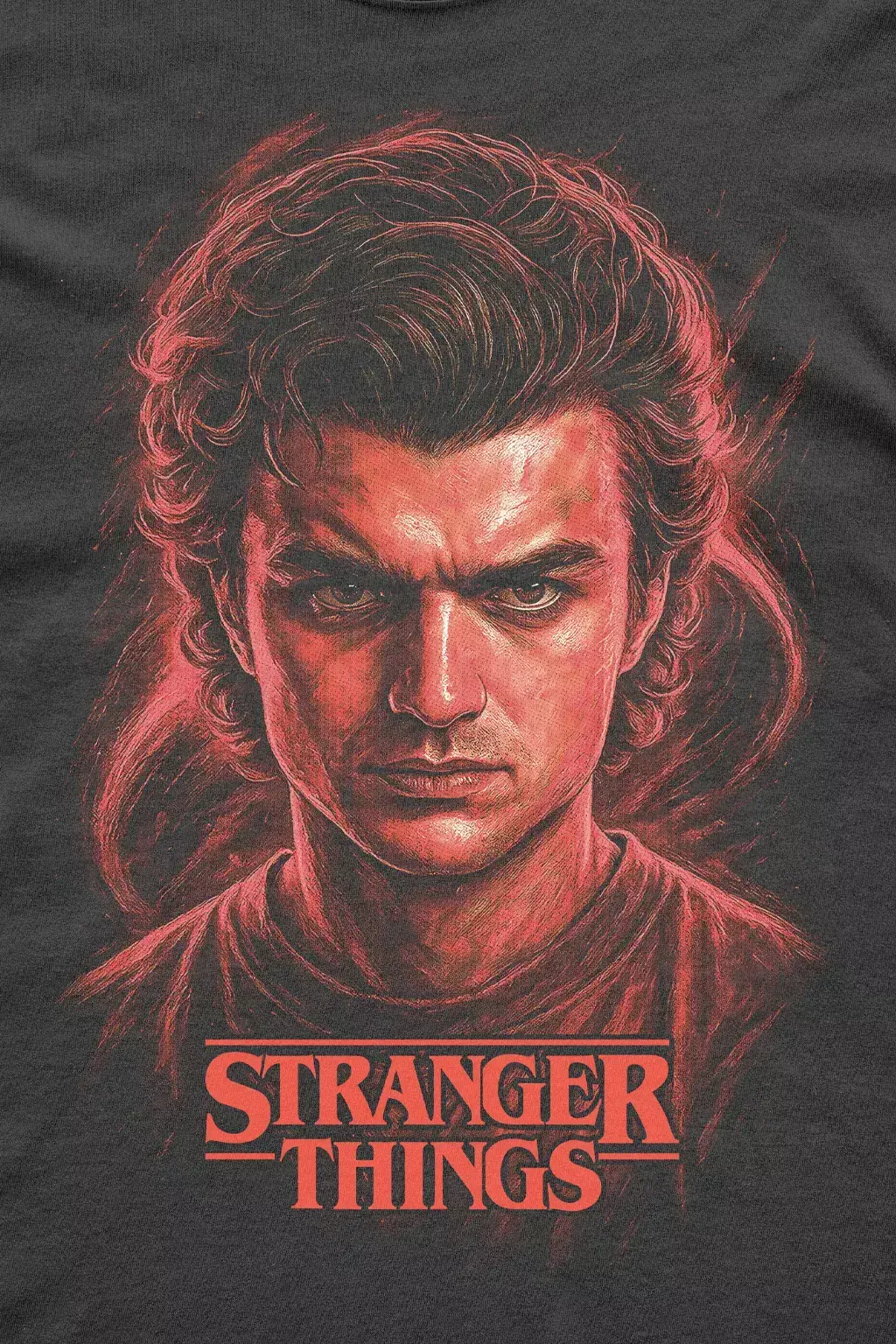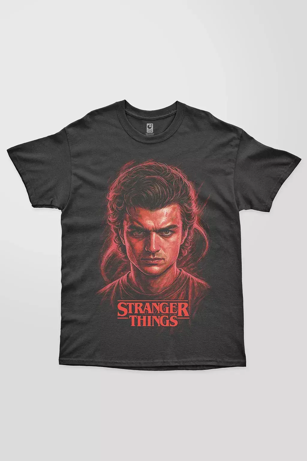 A modelagem regular garante caimento clássico e versátil, fácil de combinar com jeans ou cargo, enquanto a gola careca e reforço ombro a ombro elevam a durabilidade. A estampa DTF destaca Steve com cores vibrantes e detalhes icônicos, ideal para compor looks descolados cheios de nostalgia Hawkins.